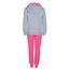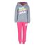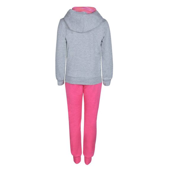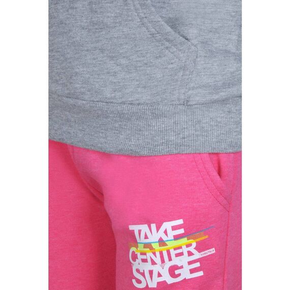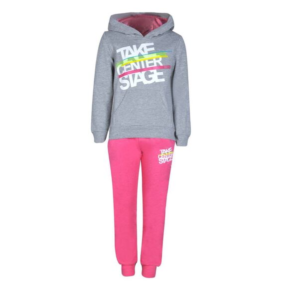 Παιδικό σετ για κορίτσια αποτελούμενο από μπλούζα με κουκούλα και φόρμα. Η μπλούζα έχει ενιαία τσέπη τύπου cangaroo και λάστιχο στα μανίκια και στην μέση. Διακοσμείται από ένα μεγάλο τύπωμα μπροστά στο ύψος του στήθους, ενώ το εσωτερικό της κουκούλας είναι από τέτοιο ύφασμα που τα χρώματα να κάνουν ‘νερά’ σε διαφορετικές αποχρώσεις. Η φόρμα του σετ έχει λάστιχο στην μέση και κορδόνι για ρύθμιση ώστε να εφαρμόζει άψογα και λάστιχο στο κάτω μέρος. Διαθέτει δύο τσέπες στο πλάι, ενώ διακοσμείται από ένα τύπωμα σε άσπρο χρώμα, στο αριστερό πόδι ψηλά στο ύψος του μηρού. Είναι ιδανικό για γυμναστική, το τρέξιμο, το παιχνίδι και το σχολείο.